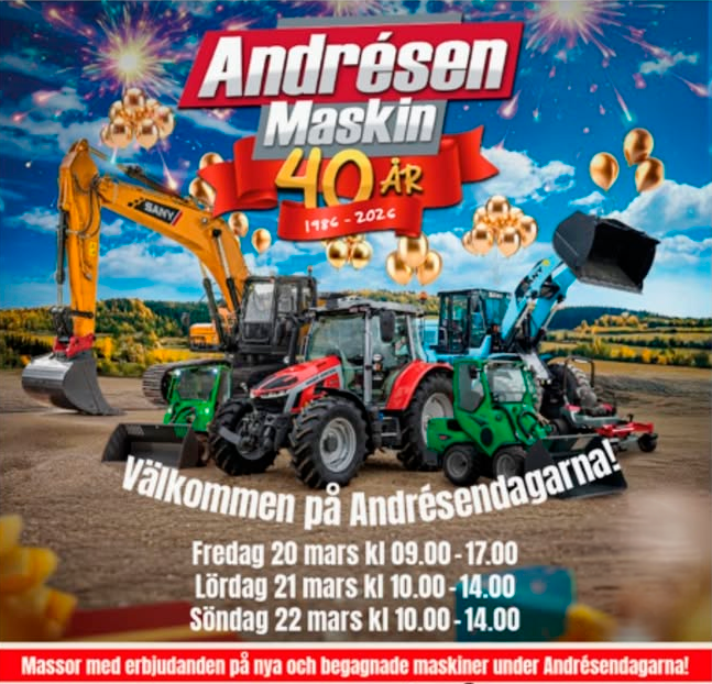 Vår Mowi-återförsäljare i Uddevalla, Andrésen Maskin firar 40-årsjubileum i helgen. Med unika erbjudanden på Mowiutrustning. Passa på – dessa erbjudande gäller endast under jubileumsdagarna 20-22 mars.